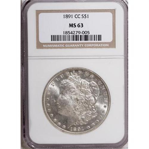 <B>1891-CC $1 MS63 NGC.</B></I> NGC Census: (1765/1415). PCGS Population (3571/2918). Mintage: 1,618,000. Numismedia Wsl. Price for NGC/PCGS coin in MS63: $650. (#7206)<BR><BR><B>Coin Engraver:</B> George T. Morgan<BR><BR><b>Shipping:</b> Coins & Currency (<a target="_blank" href="http://www.heritageauctions.com/common/shipping.php">view shipping information</a>\)