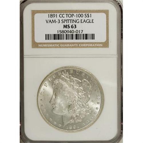 <B>1891-CC $1 MS63 NGC.</B></I> Spitting Eagle, VAM-3, Top-100. NGC Census: (1775/1422). PCGS Population (3620/2982). Mintage: 1,618,000. Numismedia Wsl. Price for NGC/PCGS coin in MS63: $650. (#7206)<BR><BR><B>Coin Engraver:</B> George T. Morgan<BR><BR><b>Shipping:</b> Coins & Currency (<a target="_blank" href="http://www.heritageauctions.com/common/shipping.php">view shipping information</a>\)