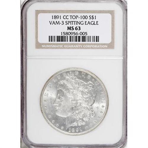 <B>1891-CC $1 MS63 NGC.</B></I> VAM-3. A Top 100 Variety. The best-known VAM for this popular Carson City issue, named the "Spitting Eagle" variety for the small die lump beneath the eagle's beak. Crisply struck and faintly toned with pleasing preservation.<BR><BR><B>Coin Engraver:</B> George T. Morgan<BR><BR><b>Shipping:</b> Coins & Currency (<a target="_blank" href="http://www.heritageauctions.com/common/shipping.php">view shipping information</a>)