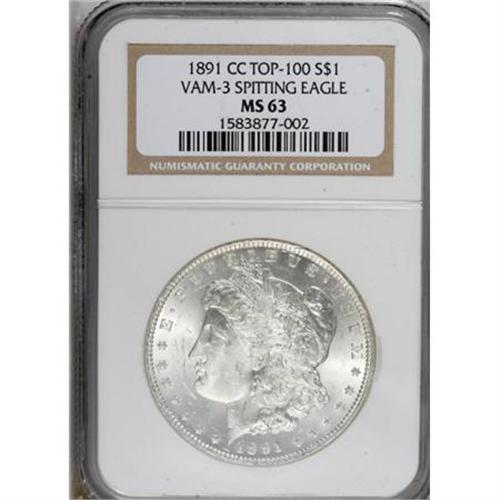<B>1891-CC $1 MS63 NGC.</B></I> VAM-3, Spitting Eagle, Top 100. NGC Census: (1828/1454). PCGS Population (3672/3098). Mintage: 1,618,000. Numismedia Wsl. Price for NGC/PCGS coin in MS63: $650. (#7206)<BR><BR><B>Coin Engraver:</B> George T. Morgan<BR><BR><b>Shipping:</b> Coins & Currency (<a target="_blank" href="http://www.heritageauctions.com/common/shipping.php">view shipping information</a>)