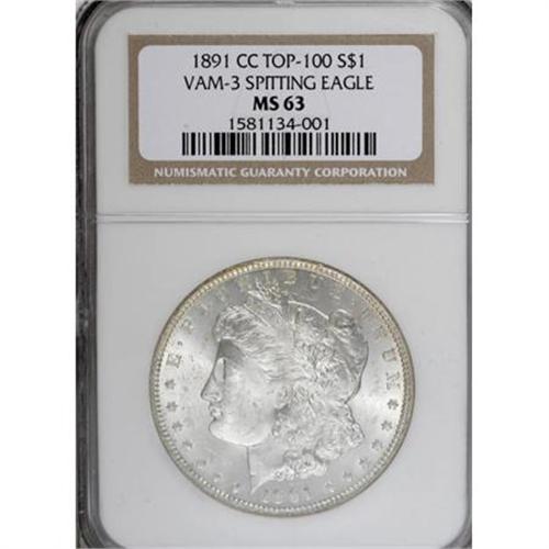 <B>1891-CC $1 MS63 NGC.</B></I> VAM-3, Top-100, Spitting Eagle. NGC Census: (1828/1454). PCGS Population (3672/3098). Mintage: 1,618,000. Numismedia Wsl. Price for NGC/PCGS coin in MS63: $650. (#7206)<BR><BR><B>Coin Engraver:</B> George T. Morgan<BR><BR><b>Shipping:</b> Coins & Currency (<a target="_blank" href="http://www.heritageauctions.com/common/shipping.php">view shipping information</a>)