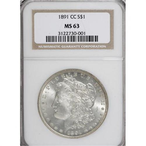 <B>1891-CC $1 MS63 NGC.</B></I> Frosty and brilliant with radiant silver luster and sharp design elements on both sides. Only the usual tiny grade-consistent marks are present.<BR><BR><B>Coin Engraver:</B> George T. Morgan<BR><BR><b>Shipping:</b> Coins & Currency (<a target="_blank" href="http://www.heritageauctions.com/common/shipping.php">view shipping information</a>)
