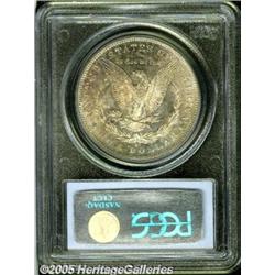 <B>1891-CC<img border='0' src='http://www.heritagecoins.com/images/star.gif' width=10 height=10>$1 MS63 PCGS.</B></I> VAM-3. A Top 100 Variety. The Spitting Eagle. Luscious mint-green and fiery crimson and orange-gold colors cover the obverse. The reverse displays more subtle purple-red, cobalt-blue, and golden-tan patina. Well struck with sparkling luster. The grade is defined by minor scuffiness, mostly on the obverse, which becomes difficult to see beneath the rich coloration.