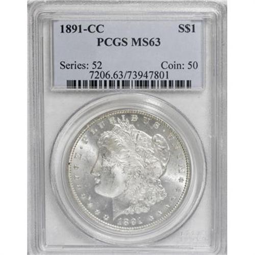 <B>1891-CC $1 MS63 PCGS.</B></I> Radiant luster exudes from the untoned surfaces of this Select Carson City Morgan, and a sharp strike imparts good definition to the motifs. A few light contact marks and luster grazes define the grade. This coin possesses great technical quality and aesthetic appeal for the grade designation.<BR><BR><b>Shipping:</b> Coins & Currency (<a target="_blank" href="http://www.heritageauctions.com/common/shipping.php">view shipping information</a>)