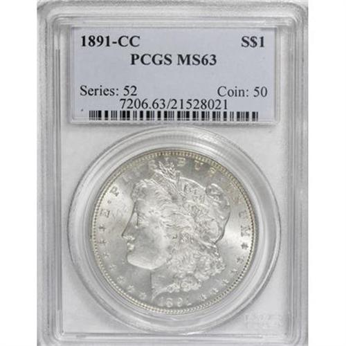 <B>1891-CC $1 MS63 PCGS.</B></I> A highly lustrous and largely untoned example from the waning years of the Carson City Mint, Select and solidly struck with light abrasions overall. A hint of cream-colored patina appears in an arc above the eagle.<BR><BR><b>Shipping:</b> Coins & Currency (<a target="_blank" href="http://www.heritageauctions.com/common/shipping.php">view shipping information</a>)