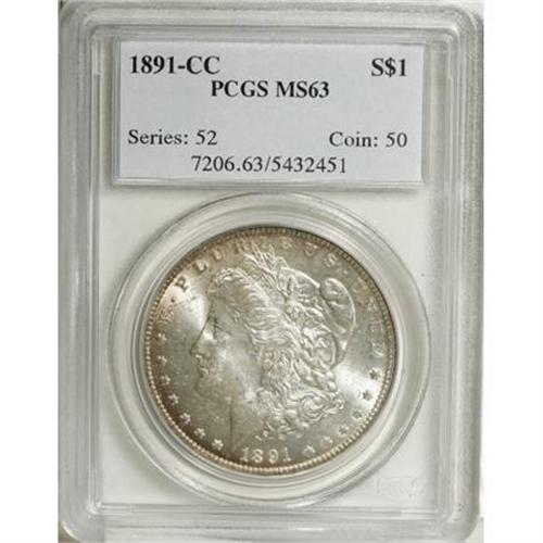 <B>1891-CC $1 MS63 PCGS.</B></I> PCGS Population (3660/3079). NGC Census: (1792/1440). Mintage: 1,618,000. Numismedia Wsl. Price for NGC/PCGS coin in MS63: $650. (#7206)<BR><BR><B>Coin Engraver:</B> George T. Morgan<BR><BR><b>Shipping:</b> Coins & Currency (<a target="_blank" href="http://www.heritageauctions.com/common/shipping.php">view shipping information</a>)