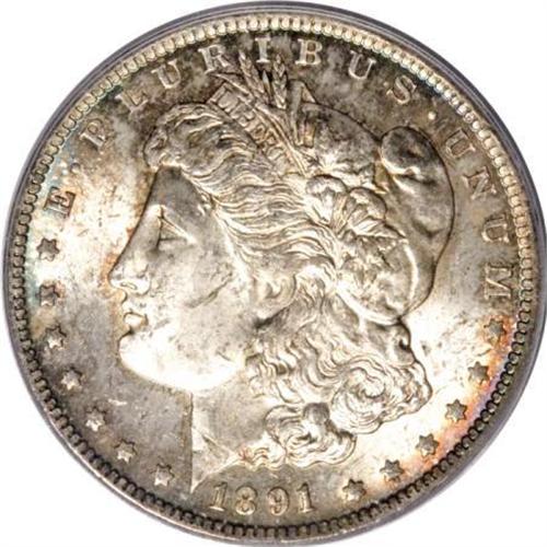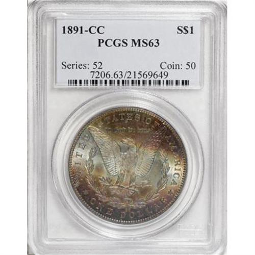 <B>1891-CC $1 MS63 PCGS.</B></I> VAM-3. A Top 100 Variety. The reverse is remarkably toned in beautiful ruby-red, forest-green, ice-blue, and yellow-gold shades. The obverse is also originally toned, but in more subtle autumn-brown and aqua tints.<BR><BR><B>Coin Engraver:</B> George T. Morgan<BR><BR><b>Shipping:</b> Coins & Currency (<a target="_blank" href="http://www.heritageauctions.com/common/shipping.php">view shipping information</a>)