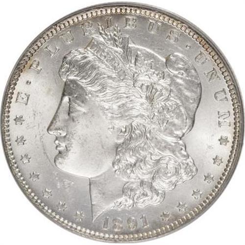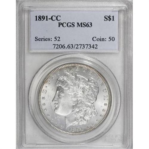 <B>1891-CC $1 MS63 PCGS.</B></I> PCGS Population (3696/3126). NGC Census: (1844/1467). Mintage: 1,618,000. Numismedia Wsl. Price for NGC/PCGS coin in MS63: $610. (#7206)<BR><BR><B>Coin Engraver:</B> George T. Morgan<BR><BR><b>Shipping:</b> Coins & Currency (<a target="_blank" href="http://www.heritageauctions.com/common/shipping.php">view shipping information</a>)