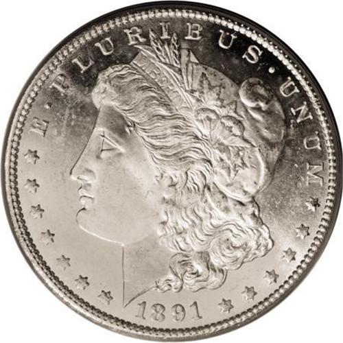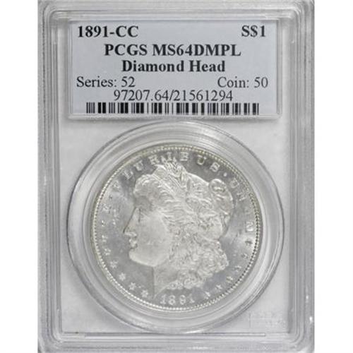 <B>1891-CC $1 MS64 Deep Mirror Prooflike PCGS.</B></I> Ex: Diamond Head. This Carson City dollar has dazzling mirrored fields and a pleasing strike. A carefully preserved and nearly untoned near-Gem that has a hint of cameo frost throughout the devices. The '91-CC is the most available Morgan from the second era of CC-mint production (1889 to 1893) but is scarce with DMPL fields. Population: 44 in 64 DMPL, 1 finer (6/07).<BR><I>From the Diamond Head Registry Set of Prooflike Dollars.</B></I><BR><BR><b>Shipping:</b> Coins & Currency (<a target="_blank" href="http://www.heritageauctions.com/common/shipping.php">view shipping information</a>)