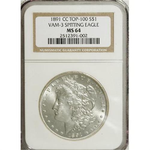 <B>1891-CC $1 Spitting Eagle MS64 NGC.</B></I> VAM-3. A Top-100 Variety. NGC Census: (1275/147). PCGS Population (2543/439). Mintage: 1,618,000. Numismedia Wsl. Price for NGC/PCGS coin in MS64: $1,150. (#7206)<BR><BR><B>Coin Engraver:</B> George T. Morgan<BR><BR><b>Shipping:</b> Coins & Currency (<a target="_blank" href="http://www.heritageauctions.com/common/shipping.php">view shipping information</a>\)