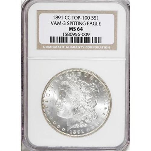 <B>1891-CC $1 MS64 NGC.</B></I> VAM-3. A Top 100 Variety. An elegantly frosty appearance enhances the visual appeal of this lustrous near-Gem. Only faintly toned on the obverse, with light champagne patina on the reverse. Faint grazes on Liberty's cheek and the left obverse field preclude an even finer grade.<BR><BR><B>Coin Engraver:</B> George T. Morgan<BR><BR><b>Shipping:</b> Coins & Currency (<a target="_blank" href="http://www.heritageauctions.com/common/shipping.php">view shipping information</a>)