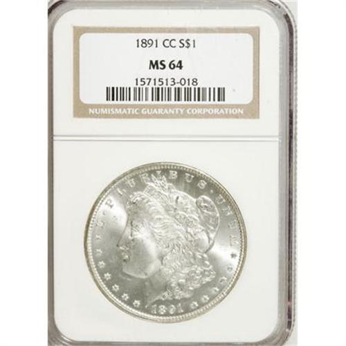 <B>1891-CC $1 MS64 NGC.</B></I> Shining with strong detail and minimal patina, an attractive Choice example of this popular Carson City issue. The fields are clean for the grade, though Liberty's jaw and neck show scattered marks and luster grazes.<BR><BR><B>Coin Engraver:</B> George T. Morgan<BR><BR><b>Shipping:</b> Coins & Currency (<a target="_blank" href="http://www.heritageauctions.com/common/shipping.php">view shipping information</a>)
