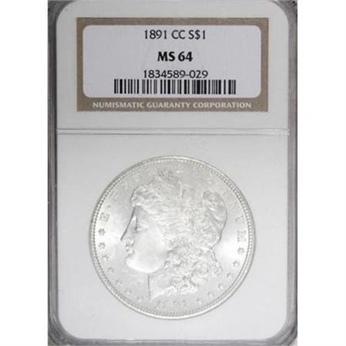 <B>1891-CC $1 MS64 NGC.</B></I> A shining Choice Mint State example that exhibits wisps of soft gold-gray patina over well preserved surfaces. Generally well struck, with only a touch of softness noted on the hair detail above Liberty's ear. <BR><BR><B>Coin Engraver:</B> George T. Morgan<BR><BR><b>Shipping:</b> Coins & Currency (<a target="_blank" href="http://www.heritageauctions.com/common/shipping.php">view shipping information</a>)