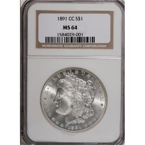 <B>1891-CC $1 MS64 NGC.</B></I> A sharply struck near-Gem example of this later Carson City dollar issue, minimally toned with bold cartwheel luster. The lightly marked devices show whispers of frost at the highpoints.<BR><BR><B>Coin Engraver:</B> George T. Morgan<BR><BR><b>Shipping:</b> Coins & Currency (<a target="_blank" href="http://www.heritageauctions.com/common/shipping.php">view shipping information</a>)