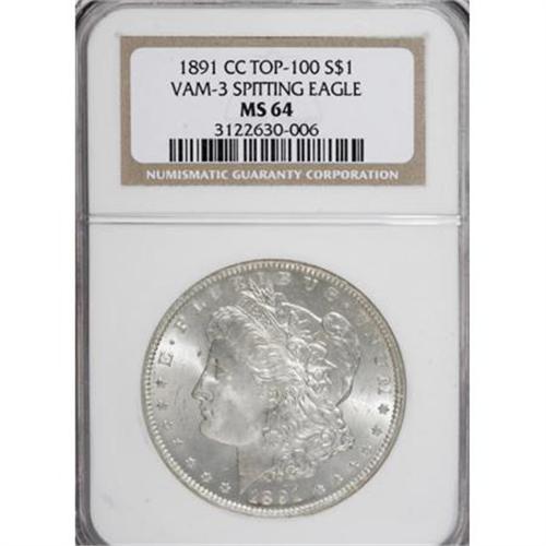 <B>1891-CC $1 MS64 NGC.</B></I> VAM-3. A Top 100 Variety. The "Spitting Eagle" variety. A few minor obverse luster grazes define the grade of this highly lustrous, untoned dollar. An attentive strike brings out sharp definition on the design features.<BR><BR><B>Coin Engraver:</B> George T. Morgan<BR><BR><b>Shipping:</b> Coins & Currency (<a target="_blank" href="http://www.heritageauctions.com/common/shipping.php">view shipping information</a>)