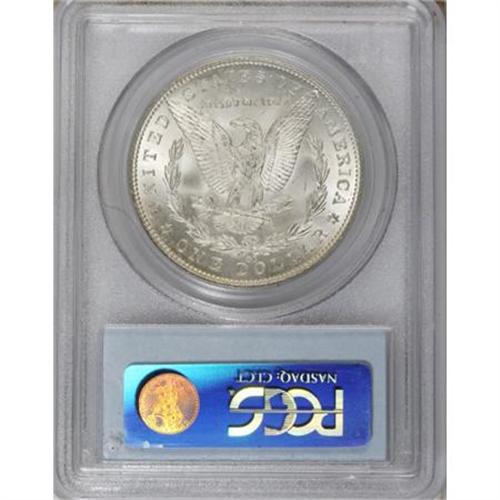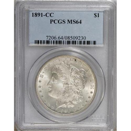 <B>1891-CC $1 MS64 PCGS.</B></I> VAM-6. STATES OF AMERICA and TRUST are lightly die doubled. This attentively struck Carson City dollar has sweeping luster and faint olive toning. The reverse is well preserved.<BR><BR><b>Shipping:</b> Coins & Currency (<a target="_blank" href="http://www.heritageauctions.com/common/shipping.php">view shipping information</a>)