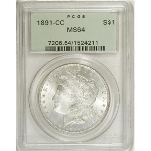 <B>1891-CC $1 MS64 PCGS.</B></I> VAM-3. A Top 100 Variety. Booming luster sweeps this carefully preserved Carson City dollar. The centers display minor incompleteness, but the overall strike is good. Encased in a green label holder.<BR><BR><b>Shipping:</b> Coins & Currency (<a target="_blank" href="http://www.heritageauctions.com/common/shipping.php">view shipping information</a>)