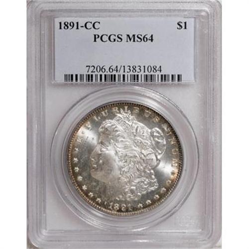 <B>1891-CC $1 MS64 PCGS.</B></I> PCGS Population (2486/432). NGC Census: (1269/146). Mintage: 1,618,000. Numismedia Wsl. Price for NGC/PCGS coin in MS64: $1,150. (#7206)<BR><BR><B>Coin Engraver:</B> George T. Morgan<BR><BR><b>Shipping:</b> Coins & Currency (<a target="_blank" href="http://www.heritageauctions.com/common/shipping.php">view shipping information</a>\)