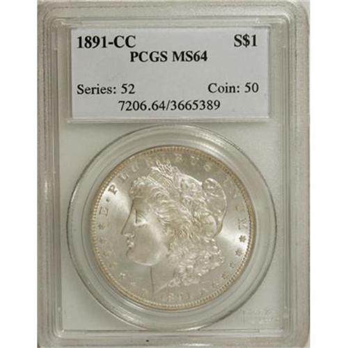 <B>1891-CC $1 MS64 PCGS.</B></I> PCGS Population (2543/439). NGC Census: (1275/147). Mintage: 1,618,000. Numismedia Wsl. Price for NGC/PCGS coin in MS64: $1,150. (#7206)<BR><BR><B>Coin Engraver:</B> George T. Morgan<BR><BR><b>Shipping:</b> Coins & Currency (<a target="_blank" href="http://www.heritageauctions.com/common/shipping.php">view shipping information</a>\)