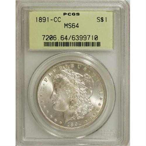 <B>1891-CC $1 MS64 PCGS.</B></I> PCGS Population (2543/439). NGC Census: (1275/147). Mintage: 1,618,000. Numismedia Wsl. Price for NGC/PCGS coin in MS64: $1,150. (#7206)<BR><BR><B>Coin Engraver:</B> George T. Morgan<BR><BR><b>Shipping:</b> Coins & Currency (<a target="_blank" href="http://www.heritageauctions.com/common/shipping.php">view shipping information</a>\)