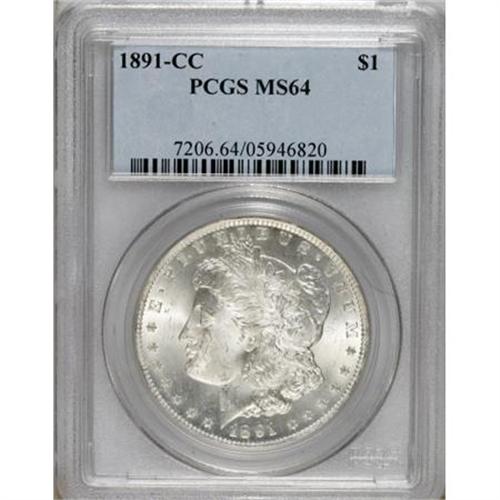 <B>1891-CC $1 MS64 PCGS.</B></I> VAM-3. A Top 100 Variety, the "Spitting Eagle." We offer here a bright near-Gem with sparkling mint luster over each side. Sharply struck, except for the centers, and brilliant throughout.<BR><BR><B>Coin Engraver:</B> George T. Morgan<BR><BR><b>Shipping:</b> Coins & Currency (<a target="_blank" href="http://www.heritageauctions.com/common/shipping.php">view shipping information</a>)
