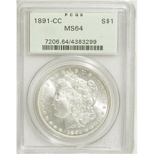 <B>1891-CC $1 MS64 PCGS.</B></I> A precisely struck and nearly brilliant near-Gem of this popular Carson City issue. The impressive eye appeal is suggestive of an even finer grade.<BR><BR><B>Coin Engraver:</B> George T. Morgan<BR><BR><b>Shipping:</b> Coins & Currency (<a target="_blank" href="http://www.heritageauctions.com/common/shipping.php">view shipping information</a>)