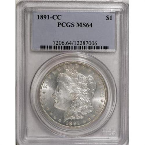<B>1891-CC $1 MS64 PCGS.</B></I> Vibrant luster with faint hints of frost on well-defined devices. Whispers of silver-gray toning visit the strongly lustrous surfaces. In sum, an attractive example of this late-date Nevada silver dollar issue.<BR><BR><B>Coin Engraver:</B> George T. Morgan<BR><BR><b>Shipping:</b> Coins & Currency (<a target="_blank" href="http://www.heritageauctions.com/common/shipping.php">view shipping information</a>)