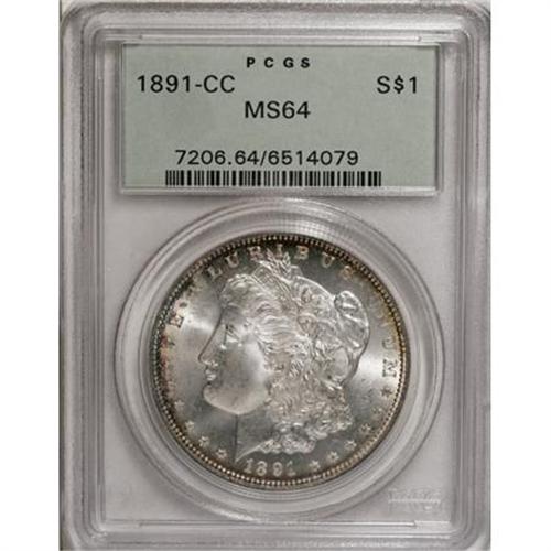 <B>1891-CC $1 MS64 PCGS.</B></I> Subtle rose and gold toning visits the softly lustrous and otherwise silver-gray surfaces of this CC-mint Morgan. Well-defined overall with a touch of milkiness to the well-preserved fields.<BR><BR><B>Coin Engraver:</B> George T. Morgan<BR><BR><b>Shipping:</b> Coins & Currency (<a target="_blank" href="http://www.heritageauctions.com/common/shipping.php">view shipping information</a>)