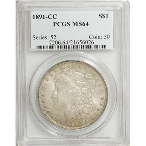 <B>1891-CC $1 MS64 PCGS.</B></I> Deeply toned gray-brown on the obverse, with traces of peripheral iridescence. The reverse is also toned, but much brighter in its appearance with ivory frost and peripheral gold accents.<BR><BR><B>Coin Engraver:</B> George T. Morgan<BR><BR><b>Shipping:</b> Coins & Currency (<a target="_blank" href="http://www.heritageauctions.com/common/shipping.php">view shipping information</a>)