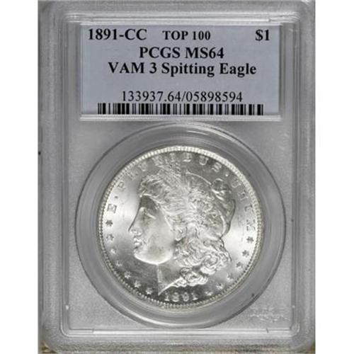 <B>1891-CC $1 MS64 PCGS.</B></I> VAM-3. A Top 100 Variety. The "Spitting Eagle". Silver-gray surfaces yield pleasing luster and well struck design elements. A few minute marks define the grade. Population: 20 in 64, 5 finer (1/08).<BR><BR><b>Shipping:</b> Coins & Currency (<a target="_blank" href="http://www.heritageauctions.com/common/shipping.php">view shipping information</a>)