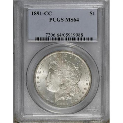 <B>1891-CC $1 MS64 PCGS.</B></I> VAM-3. A Top 100 Variety. The famous "Spitting Eagle". This example is lustrous and lightly toned, with a slight tint of rose over the silver-gray surfaces. Boldly struck with distinct roller marks across Liberty's ear and jaw, and typical surface blemishes for the grade. <BR><BR><B>Coin Engraver:</B> George T. Morgan<BR><BR><b>Shipping:</b> Coins & Currency (<a target="_blank" href="http://www.heritageauctions.com/common/shipping.php">view shipping information</a>)
