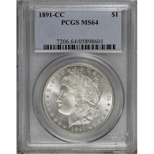 <B>1891-CC $1 MS64 PCGS.</B></I> All of the design features are impressively struck, and the silver-gray surfaces are essentially untoned, save for a bit of milkiness in the fields. A few trivial marks on the cheek, and in the left obverse field, keep the piece from a Gem holder. Still an attractive Morgan dollar from the Carson City Mint. <BR><BR><B>Coin Engraver:</B> George T. Morgan<BR><BR><b>Shipping:</b> Coins & Currency (<a target="_blank" href="http://www.heritageauctions.com/common/shipping.php">view shipping information</a>)
