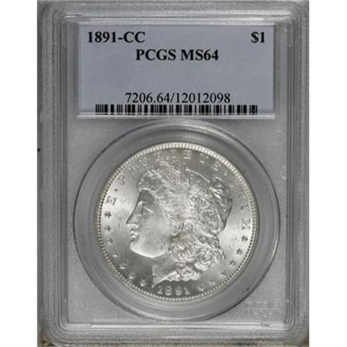 <B>1891-CC $1 MS64 PCGS.</B></I> This well-defined silver-white near-Gem shows occasional hints of cloud-gray haze near the rims. The surfaces show more luster grazes than actual marks, though the overall effect puts a finer grade just out of reach for this attractive example.<BR><BR><B>Coin Engraver:</B> George T. Morgan<BR><BR><b>Shipping:</b> Coins & Currency (<a target="_blank" href="http://www.heritageauctions.com/common/shipping.php">view shipping information</a>)