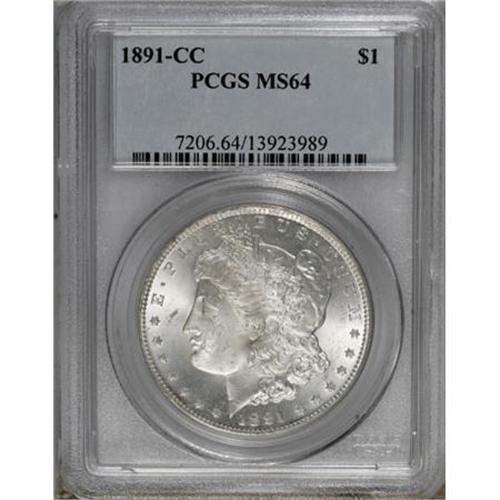 <B>1891-CC $1 MS64 PCGS.</B></I> Both sides offer powerful luster beneath thin, even silver-gray patina that shows occasional hints of rose. Well-defined overall with only a few faint marks that preclude Gem status.<BR><BR><B>Coin Engraver:</B> George T. Morgan<BR><BR><b>Shipping:</b> Coins & Currency (<a target="_blank" href="http://www.heritageauctions.com/common/shipping.php">view shipping information</a>)