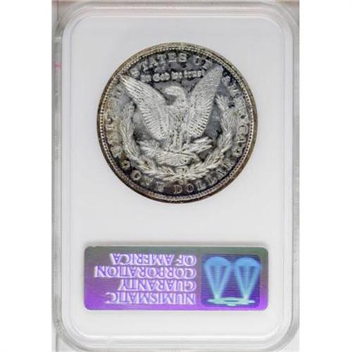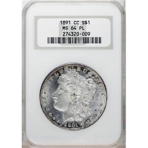 <B>1891-CC $1 MS64 Prooflike NGC.</B></I> Specks of cobalt-blue, purple, and golden-brown patina are more evident on the reverse of this suitably struck near-Gem Prooflike coin. Scattered luster grazes define the grade. Census: 61 in 64 Prooflike, 6 finer (1/08).<BR><BR><B>Coin Engraver:</B> George T. Morgan<BR><BR><b>Shipping:</b> Coins & Currency (<a target="_blank" href="http://www.heritageauctions.com/common/shipping.php">view shipping information</a>)