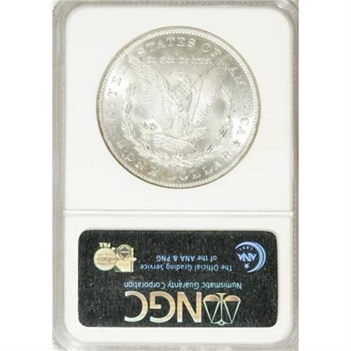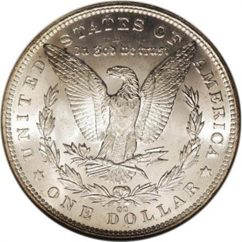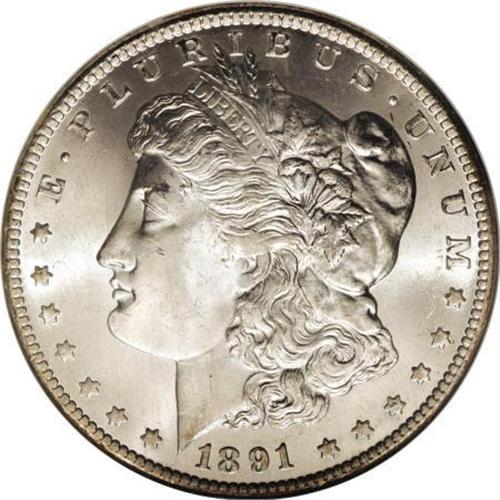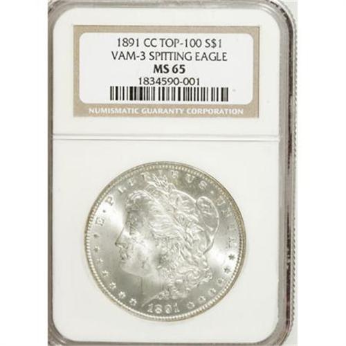 <B>1891-CC $1 MS65 NGC.</B></I> Spitting Eagle. VAM-3. Top 100 Variety. The thick mint luster that covers each side shows only a few small, inoffensive abrasions. Snow-white throughout, the striking details are strong but not quite complete in the centers. A popular and widely collected Carson City variant.<BR><BR><B>Coin Engraver:</B> George T. Morgan<BR><BR><b>Shipping:</b> Coins & Currency (<a target="_blank" href="http://www.heritageauctions.com/common/shipping.php">view shipping information</a>)