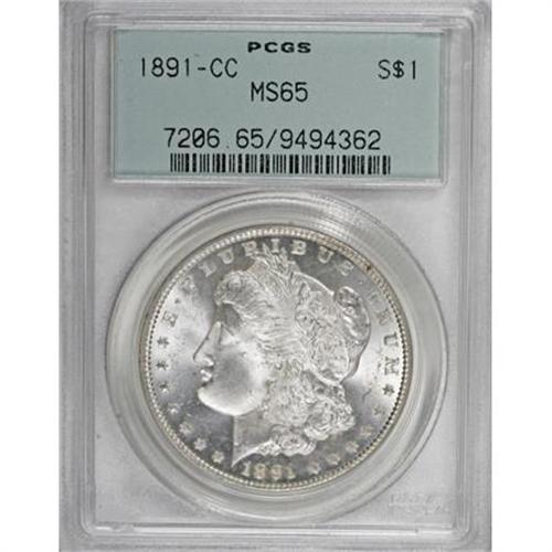 <B>1891-CC $1 MS65 PCGS. CAC.</B></I> Outstanding luster and a precise strike combine with impressively unperturbed surfaces to ensure the exceptional quality of this Carson City Gem. Each side has glimpses of tan toning, but the piece is otherwise brilliant. Encased in an old green label holder.<BR><BR><B>Coin Engraver:</B> George T. Morgan<BR><BR><b>Shipping:</b> Coins & Currency (<a target="_blank" href="http://www.heritageauctions.com/common/shipping.php">view shipping information</a>)