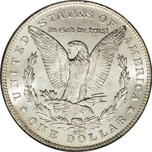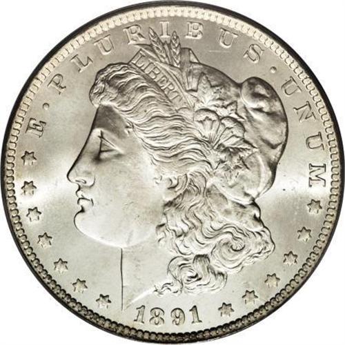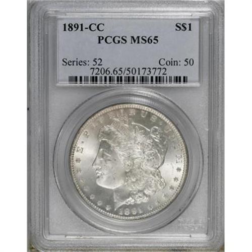 <B>1891-CC $1 MS65 PCGS.</B></I> VAM-3. A Top 100 Variety. The well-known and distinctive "Spitting Eagle" variety, which constitutes perhaps half of all Uncirculated 1891-CC dollars. This highly lustrous example has only a hint of tan toning, and the minor marks present fail to challenge the eye appeal.<BR><BR><B>Coin Engraver:</B> George T. Morgan<BR><BR><b>Shipping:</b> Coins & Currency (<a target="_blank" href="http://www.heritageauctions.com/common/shipping.php">view shipping information</a>)