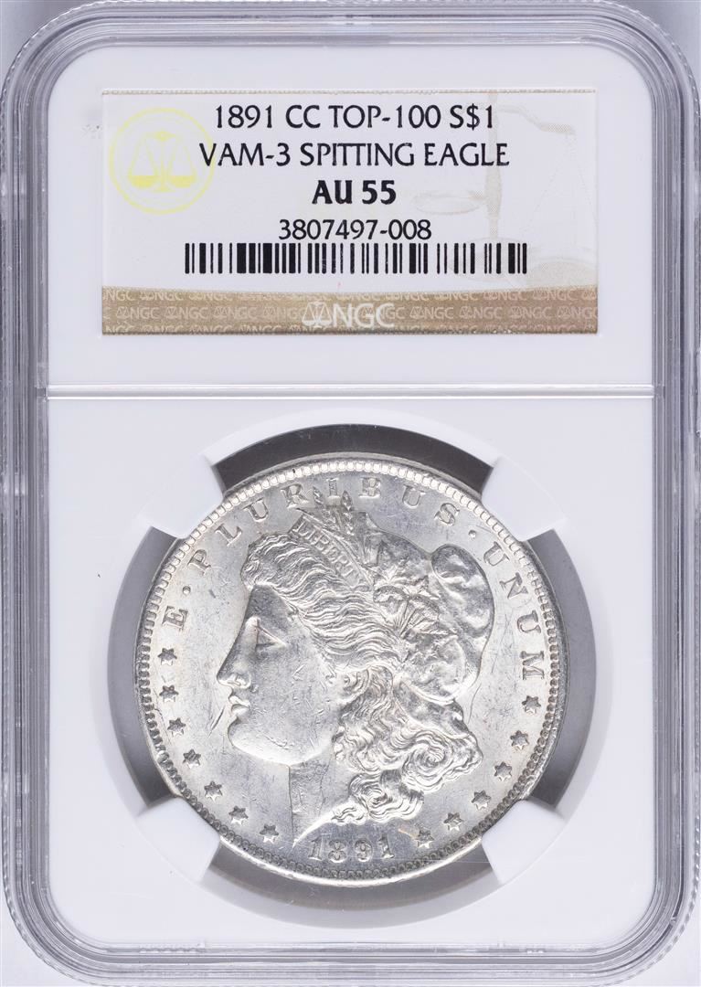 One 1891-CC $1 Morgan Silver Dollar Coin NGC AU55 VAM-3 Spitting Eagle. NGC Certified.