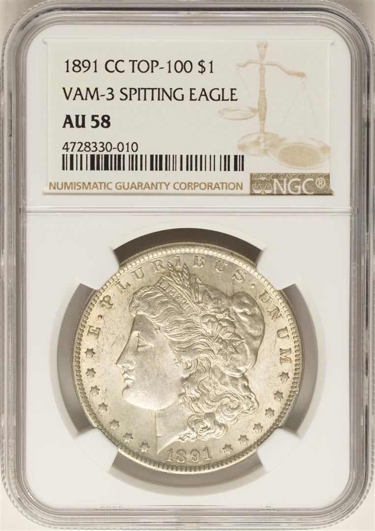 One 1891-CC $1 Morgan Silver Dollar Coin NGC AU58 Top 100 VAM-3 Spitting Eagle. NGC Certified.