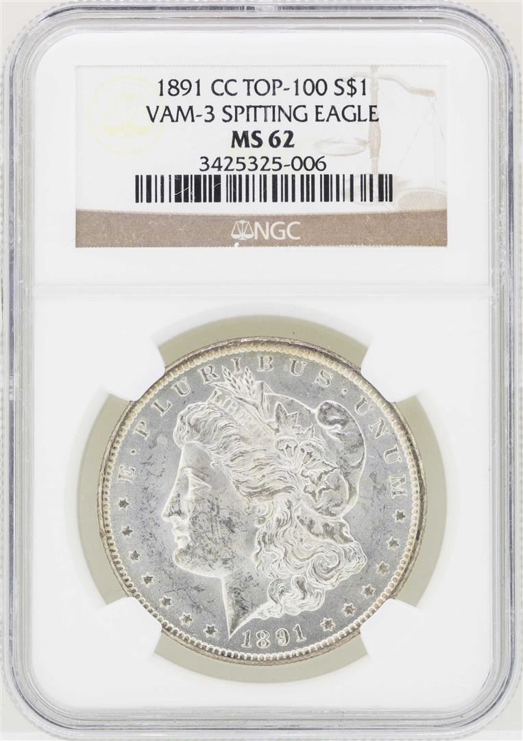 One 1891-CC $1 Morgan Silver Dollar Coin VAM-3 Spitting Eagle NGC MS62. NGC Certified.