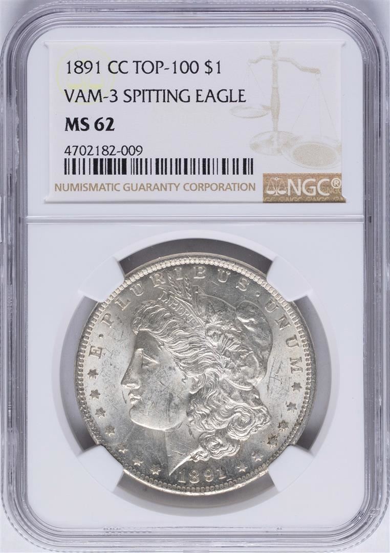 One 1891-CC $1 Morgan Silver Dollar Coin VAM-3 Spitting Eagle NGC MS62. NGC Certified.