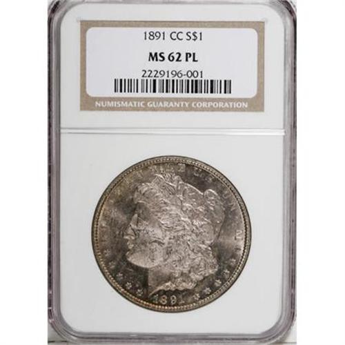 <B>1891-CC $1 MS62 Prooflike NGC.</B></I> NGC Census: (52/166). PCGS Population (136/260). Numismedia Wsl. Price for NGC/PCGS coin in MS62: $400. (#7207)<BR><BR><B>Coin Engraver:</B> George T. Morgan<BR><BR><b>Shipping:</b> Coins & Currency (<a target="_blank" href="http://www.heritageauctions.com/common/shipping.php">view shipping information</a>)