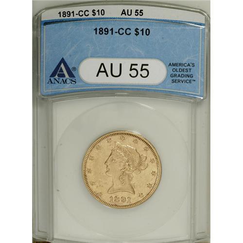 <B>1891-CC $10 AU55 ANACS.</B></I> A briefly circulated Carson City gold type coin with noticeable luster and a few subdued marks on the left obverse field.<BR><BR><b>Shipping:</b> Coins & Currency (<a target="_blank" href="http://www.heritageauctions.com/common/shipping.php">view shipping information</a>)
