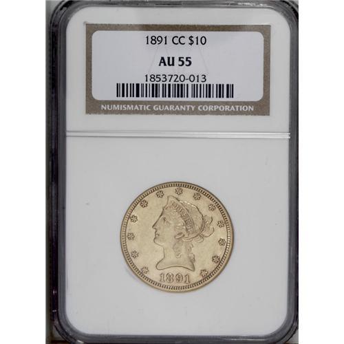 <B>1891-CC $10 AU55 NGC.</B></I> This amber-gold piece has ample original luster and light highpoint wear that blends with the soft strike. The usual handling marks appear on the surfaces.<BR><BR><b>Shipping:</b> Coin/Currency (<a target="_blank" href="http://www.heritageauctions.com/common/shipping.php">view shipping information</a>)