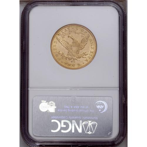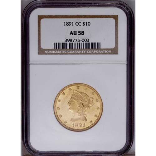 <B>1891-CC $10 AU58 NGC.</B></I> Breen-7035. The mintmark is sharply repunched east. Extensive luster accompanies moderately abraded surfaces.