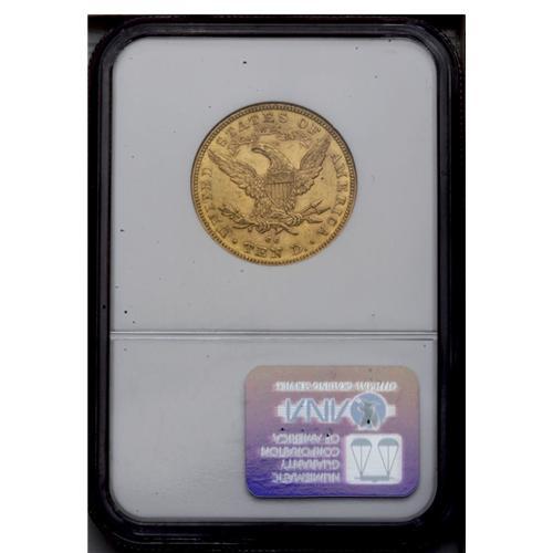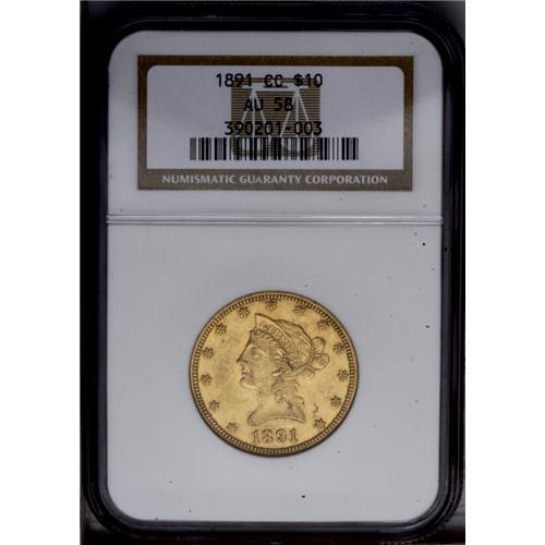 <B>1891-CC<$10> AU58 NGC.</B></I> This boldly impressed and undisturbed green-gold CC-mint example possesses full peripheral luster with occasional penetration into the open fields.<BR><I>From The Steve Glenn Collection.</B></I> <BR><BR><B>Important notice:</B> Heritage usually auctions material at the rate of 200-250 lots per hour. On some occasions eBay Live bid software or the Internet may not be able to keep up with the pace of the auction. We recommend placing a realistic absentee bid now as insurance to avoid disappointment. Occasionally the auctioneer may eliminate or reject an eBay Live bid, and the auctioneer may also reopen a lot after the close of the eBay live bidding (usually because we missed an audience bid), and may reject your bid even if it shows you as the winning bidder. By bidding via eBay Live, you agree that Heritage may award the lot to another bidder at its sole discretion under the circumstances described above or any other reasonable circumstances. Since eBay bids are not shown to us until we open the lot on the floor, we treat those bids just like floor bids. In most cases the floor responds before the eBay bid is presented to us, due to Internet lag time, so for consistency we have made it a policy that floor bids are always considered first over tie eBay live bids. Also please note that all Heritage lots purchased through eBay Live carry a 20% Buyer's Premium. Please make sure you read the Terms and Conditions before you bid. This lot is being auctioned in conjunction with a live floor auction by Heritage Galleries & Auctioneers. All final auction and invoice information will be supplied by Heritage Galleries & Auctioneers, and all other information should be considered preliminary. Lot:4021 <BR><BR><B>Winning Notification and Billing:</B> After the FINAL session in this auction is complete, Heritage will send e-mail and snail mail invoices. This process normally takes several days. All final auction and invoice information will be supplied by Heritage Galleries & Auctioneers, and all other information should be considered preliminary. <BR><BR>This auction will be conducted on a live auction floor and over the Internet through eBay Live. If you choose to place an absentee bid, please take a moment to <font color='#0000ff'><u><a href='http://pages.ebay.com/liveauctions/help/before/laabsentee.html'>learn how eBay Live absentee bidding works</a></u></font><font color='#000000'>