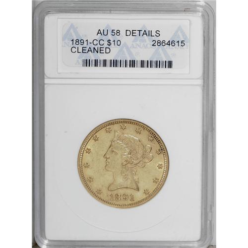 <B>1891-CC $10 --Cleaned--ANACS. AU58 Details.</B></I> A nicely struck piece from this comparatively high-mintage Carson City issue. The orange-gold surfaces retain substantial luster despite cleaning, though a moderate abrasion appears at the truncation of the bust.<BR><BR><b>Shipping:</b> Coin/Currency (<a target="_blank" href="http://www.heritageauctions.com/common/shipping.php">view shipping information</a>)