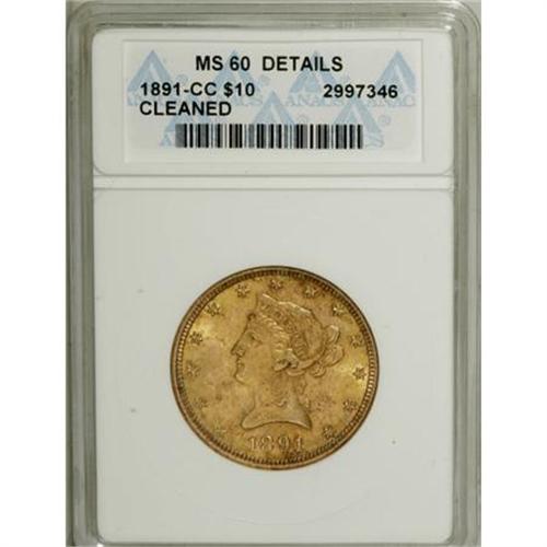 <B>1891-CC $10 --Cleaned--ANACS. MS60 Details.</B></I> NGC Census: (215/879). PCGS Population (259/545). Mintage: 103,732. Numismedia Wsl. Price for NGC/PCGS coin in MS60: $850. (#8720)<BR><BR><B>Coin Engraver:</B> Christian Gobrecht<BR><BR><b>Shipping:</b> Coins & Currency (<a target="_blank" href="http://www.heritageauctions.com/common/shipping.php">view shipping information</a>\)