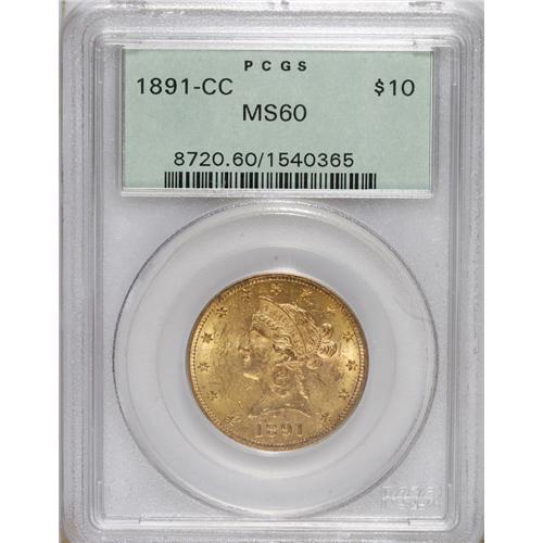 1891-CC $10 MS60 PCGS. Well struck and highly lustrous